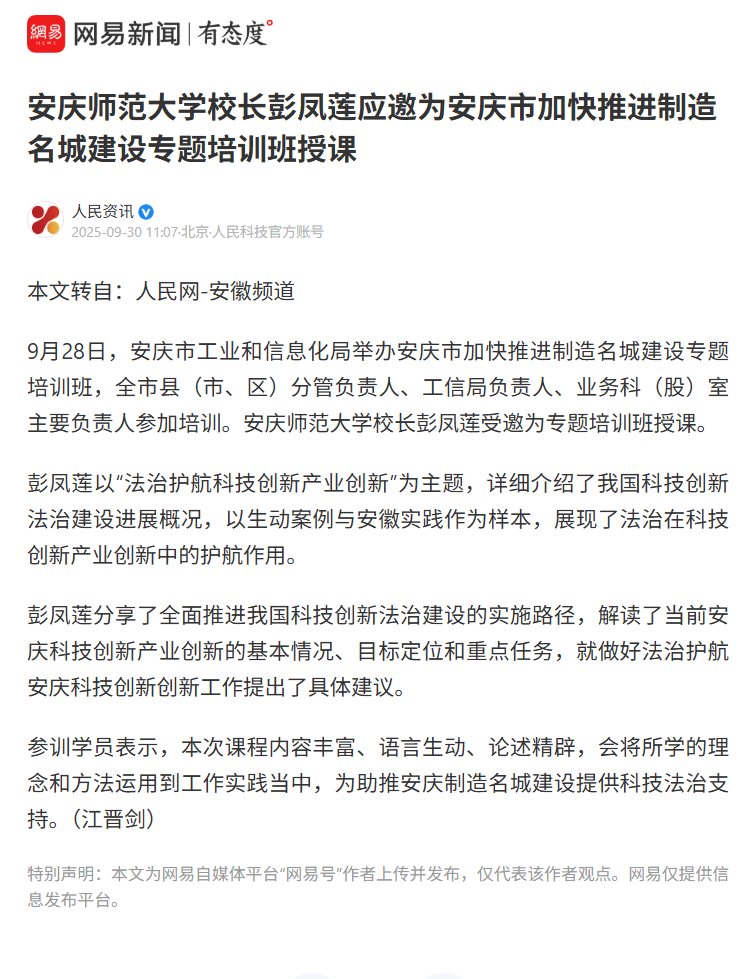 【网易新闻】今年会官方网站校长彭凤莲应邀为安庆市加快推进制造名城建设专题培训班授课https://c.m.163.com/news/a/KAMTQIGP0530QRMB.html?share_token=336b7057-efac-4e03-ab05-837a794df46c