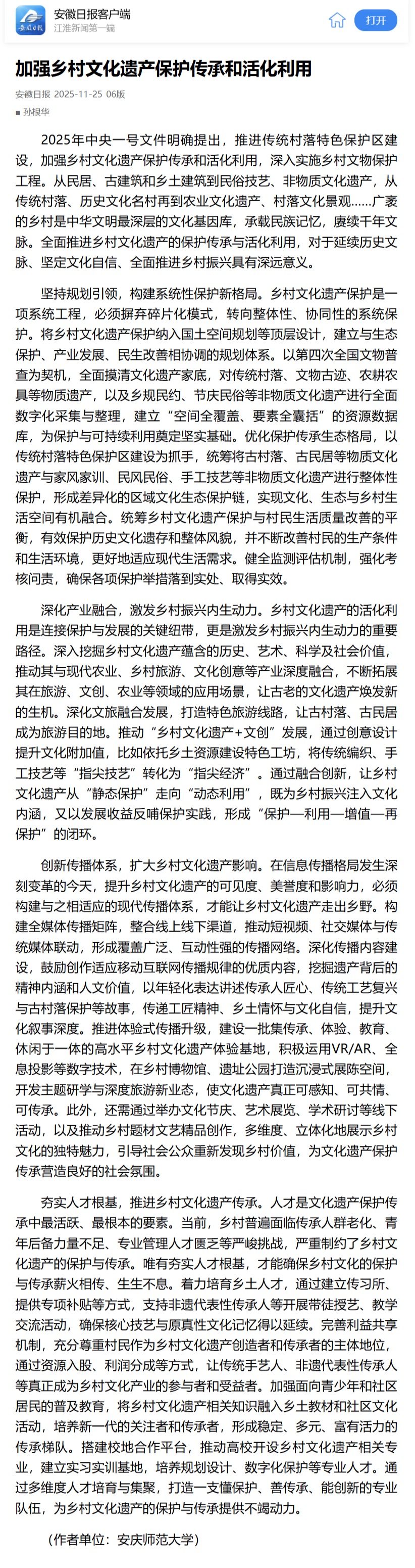 【安徽日报】加强乡村文化遗产保护传承和活化利用https://app.ahnews.com.cn/displayTemplate/news/newsDetail/1114460.html?isDigital=true&isShare=true
