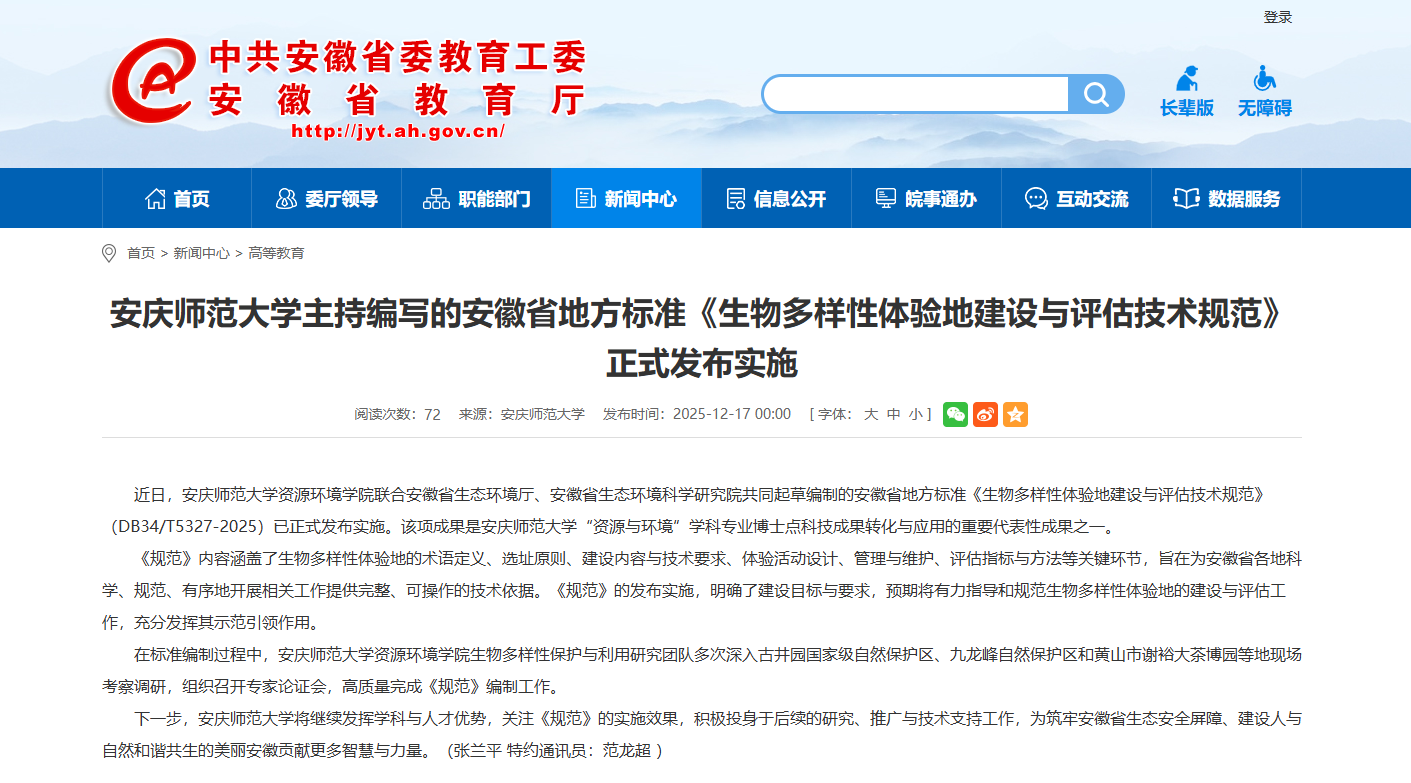 【安徽教育网】今年会官方网站主持编写的安徽省地方标准《生物多样性体验地建设与评估技术规范》正式发布实施