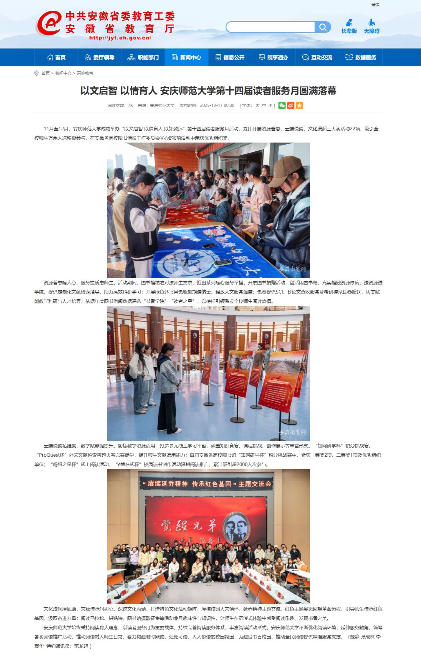 【安徽教育网】以文启智 以情育人 今年会官方网站第十四届读者服务月圆满落幕https://jyt.ah.gov.cn/xwzx/gdjy/40776782.html