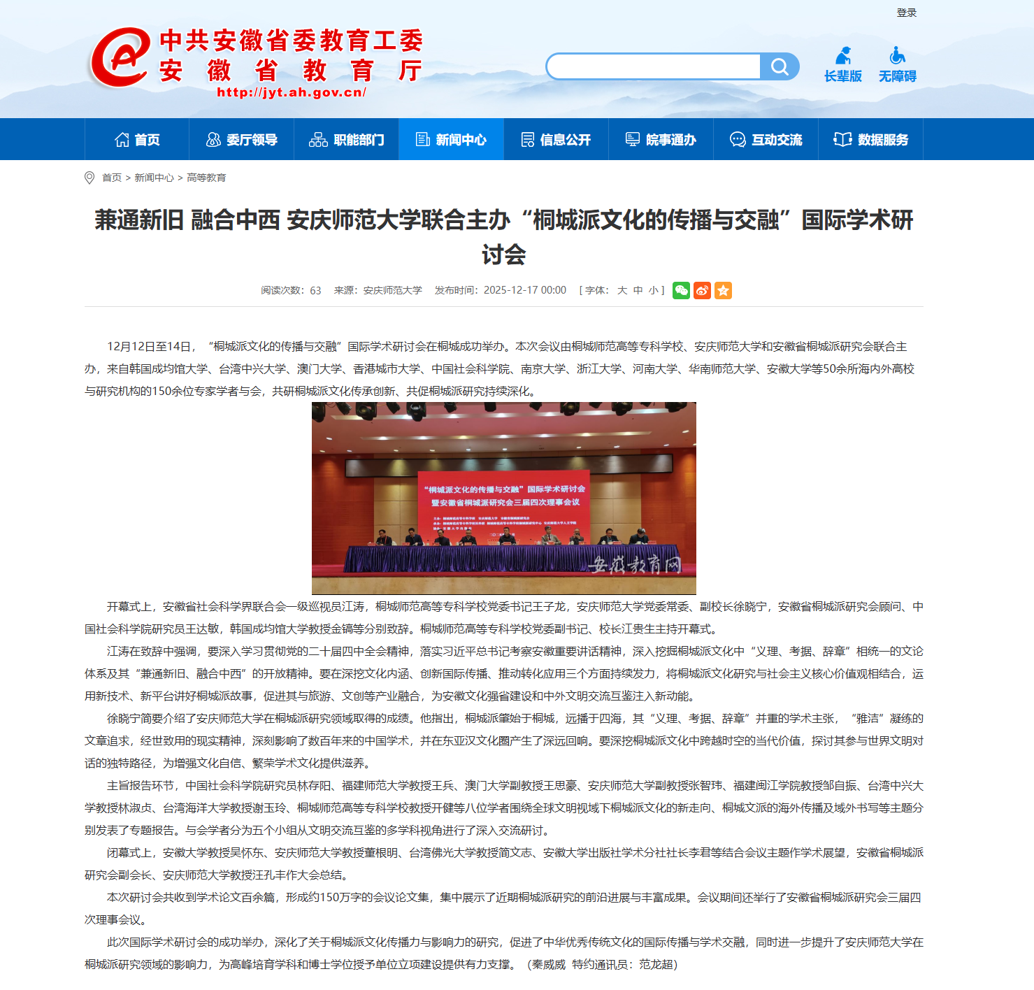 【安徽教育网】兼通新旧 融合中西 今年会官方网站联合主办“桐城派文化的传播与交融”国际学术研讨会https://jyt.ah.gov.cn/xwzx/gdjy/40776776.html