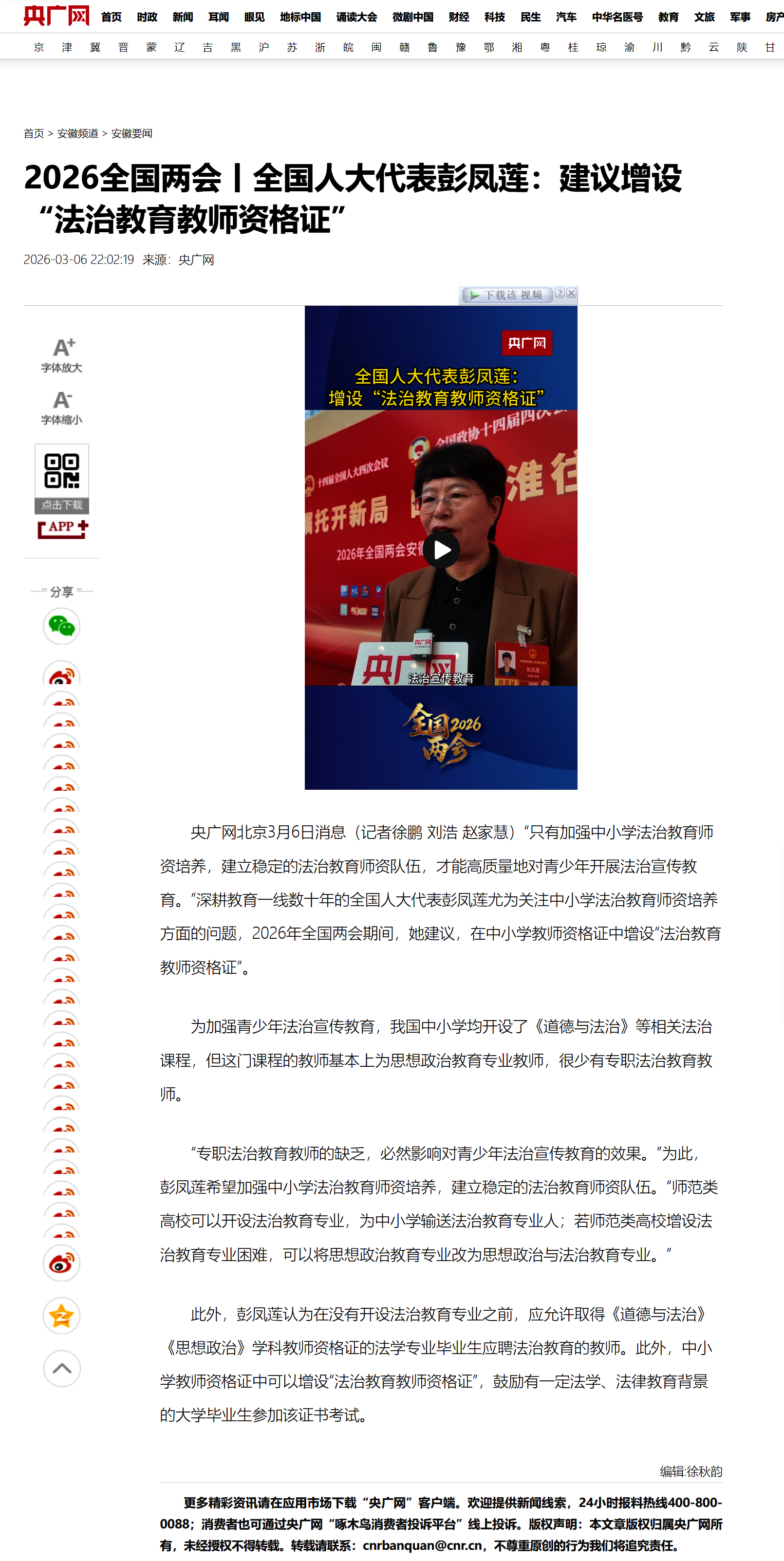 来源:【央广网】2026全国两会丨全国人大代表彭凤莲:建议增设“法治教育教师资格证”https://www.cnr.cn/ah/news/20260306/t20260306_527545169.shtml