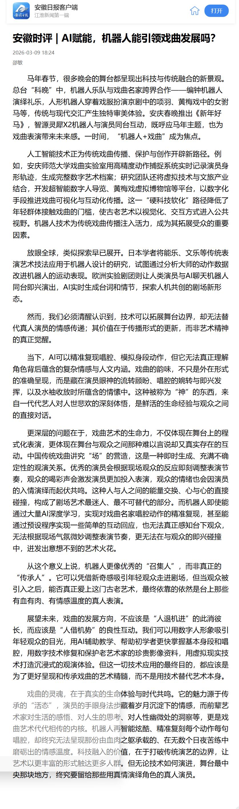 来源:【安徽日报客户端】安徽时评 | AI赋能,机器人能引领戏曲发展吗?https://app.ahnews.com.cn/displayTemplate/news/newsDetail/4307/1699685.html?isShare=true