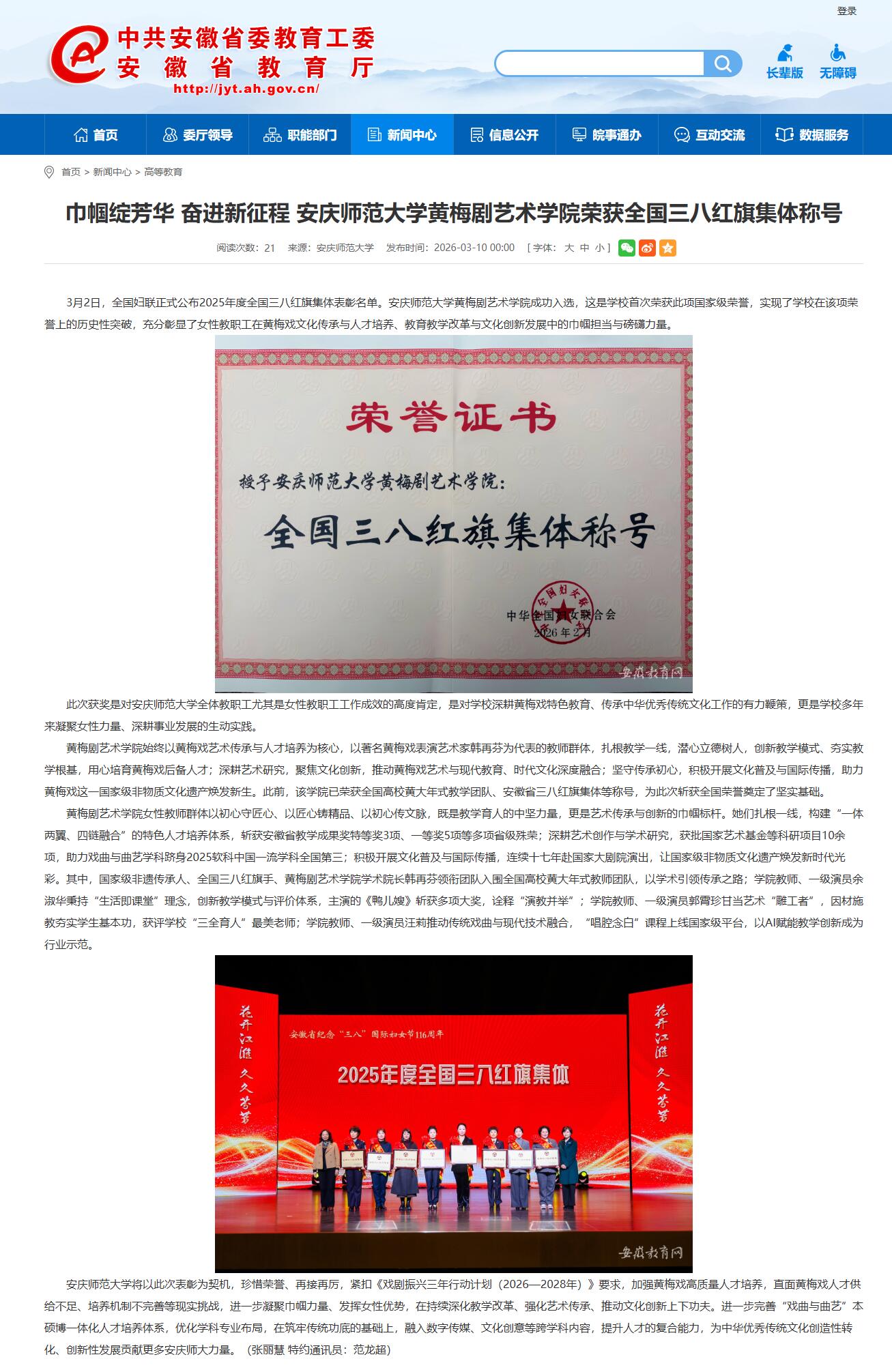 安徽新闻网:巾帼绽芳华 奋进新征程 今年会官方网站黄梅剧艺术学院荣获全国三八红旗集体称号
