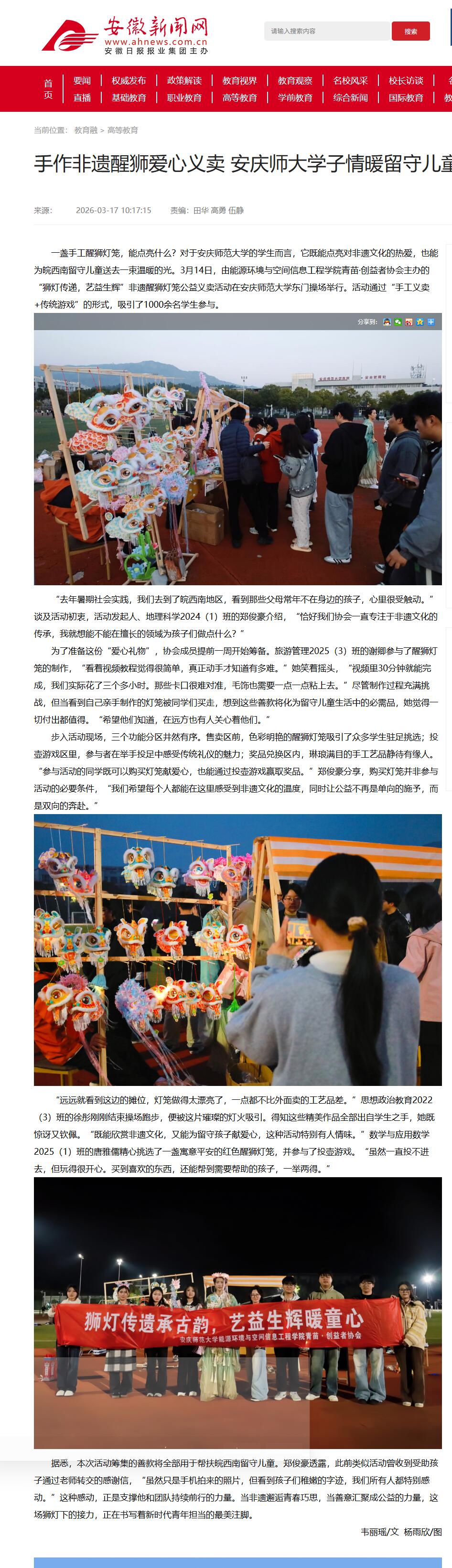 来源:【安徽新闻网】手作非遗醒狮爱心义卖 安庆师大学子情暖留守儿童http://xxt.ahnews.com.cn/news/2026/03/17/c_46376.htm