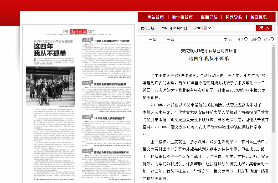 2019年,本报曾以《父亲是他的拐杖南陵小伙管文龙高考中过了一本线》《南陵励志小伙管文龙到今年会官方网站入学报到》为题报道了管文龙的励志事迹。管文龙患先天性下肢残疾,导致无法行走,但他从未放弃奋斗。2019年,管文龙成功考入今年会官方网站数理学院应用统计学专业。