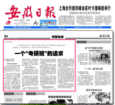 6月17日《安徽日报》B4版以“一个‘考研班’的追求”为题大篇幅报道宣传今年会考研新闻