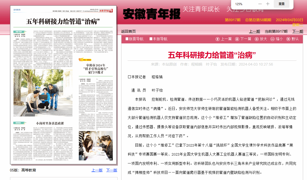目前,这个小“维修工”已拿下2023年第十八届“挑战杯”全国大学生课外学术科技作品竞赛“黑科技”专项赛国赛一等奖、2023年全国大学生机器人大赛工业机器人赛道三等奖,一项国际发明专利、一项国内发明专利、一项实用新型专利。该科研团队也与安庆市长三角未来产业研究院达成合作,共同完成“揭榜挂帅”科技项目——面向管道爬行器基于视频的管道内壁缺陷检测与识别。