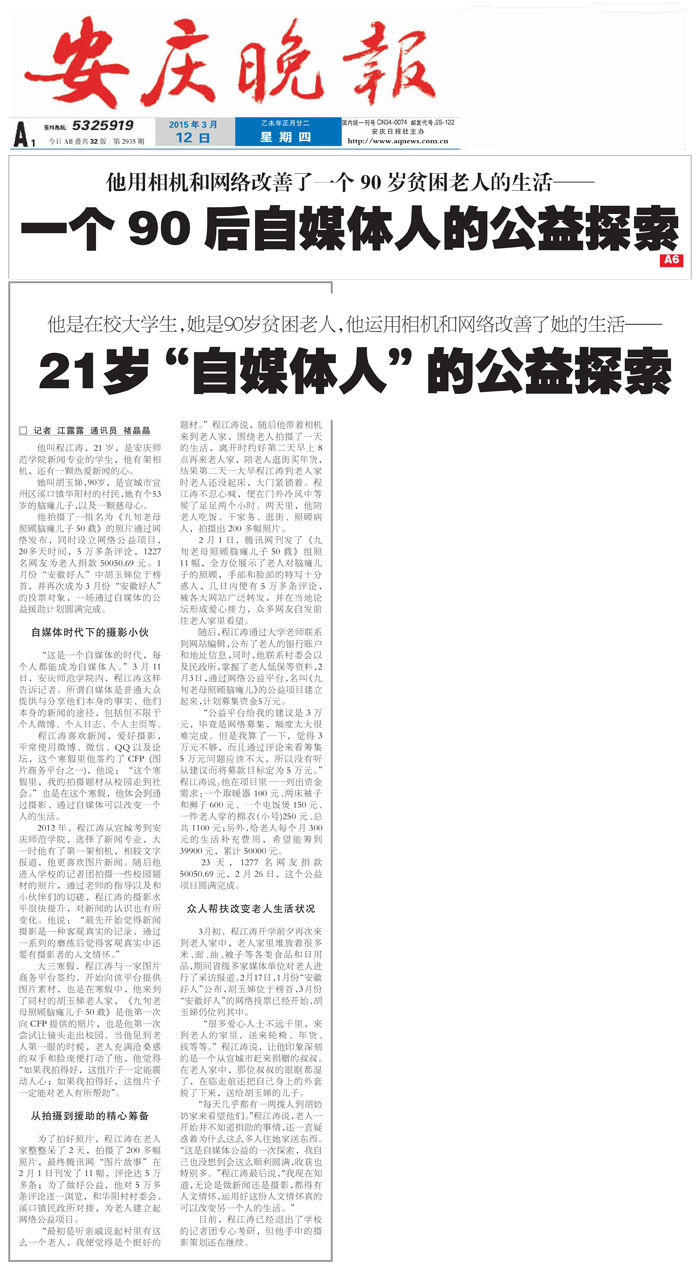 编者按:3月12日,《安庆晚报》“社会新闻”版大篇幅登载今年会学生记者采写的稿件《21岁“自媒体人”的公益探索》,报道了今年会学生记者程江涛用摄影、网络为九旬照顾脑瘫儿老母胡玉娣筹集善款,使得这位具有大爱的贫困母亲引起广泛关注,并最终当选“安徽好人”。