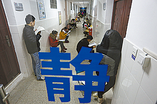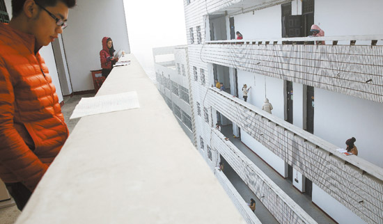 12月8日清晨,安徽省安庆师范学院菱湖校区教学楼的走廊上到处都是考研学生。一些考生怕诵读影响到自习室里的同学,就来到楼梯或者走廊上背书。