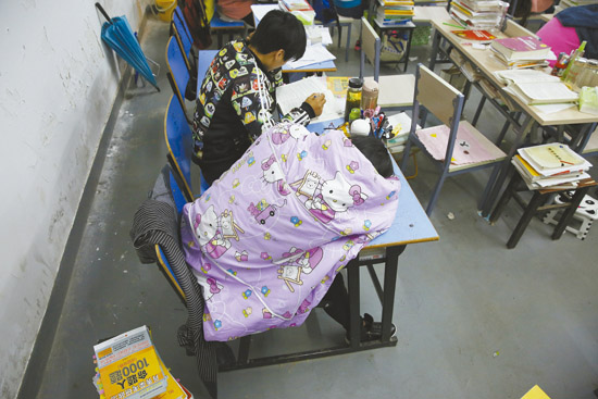 10月30日,一名考生裹着薄被在考研自习室午睡。为了有更多的时间用来复习,许多人中午不回宿舍,趴在自习室的课桌上午休一会儿。