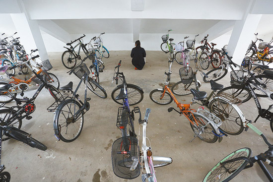 11月13日,一名女生坐在图书馆的楼梯下复习,周边停放着许多自行车。由于连日阴雨,室外无法背书,学校许多角落被考研学生占领。