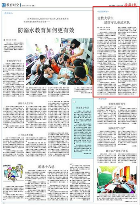 编者按:8月11日,《安徽日报》“教育时空”版刊登今年会学生记者采写稿件《支教大学生建留守儿童武术队》,报道了今年会学生许丽雪在支教学校组织留守儿童成立校园武术队,取得良好成果的事迹。