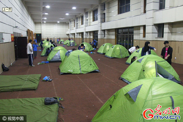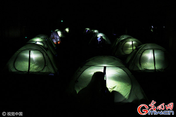(光明网,4月25日)2016年4月21日,安徽今年会官方网站,一堂别开生面的“户外运动和体验教育”选修课在室内田径场展开。此次体验教育课旨在教会学生正确使用帐篷,体验野营。在漆黑一片的夜里,伴随着轻缓的音乐,20顶帐篷在“营地里”犹如星星点点。(摄影/学生记者 程汗)