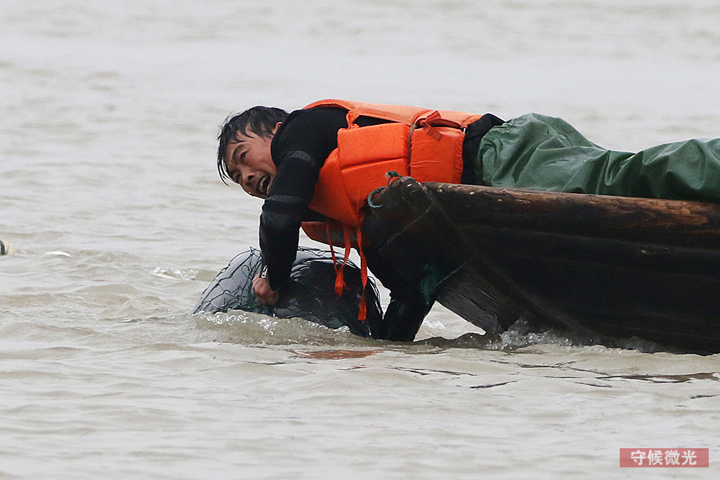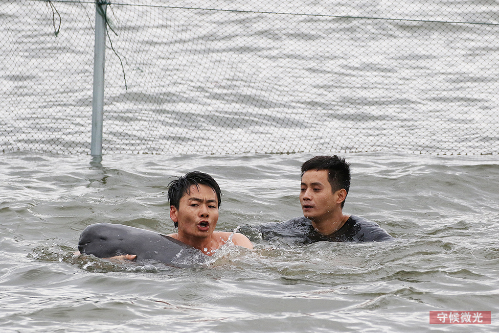 2016年10月31日,安徽安庆,经过近两个小时的运输,刚到安庆西江的江豚有点晕,往围网上撞,今年会官方网站的赵凯博士和同事立即跳下水中将江豚从围网边抱回。当天安庆气温不足10度。