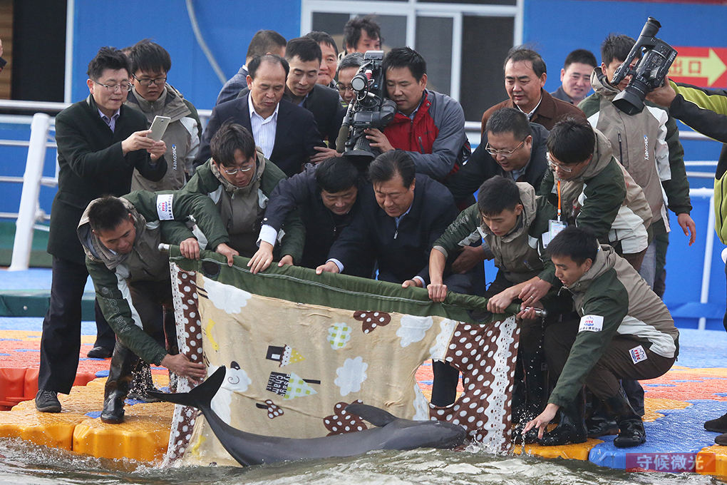 2016年11月8日,安徽安庆,从湖北天鹅洲豚类自然保护区运来的两头雄豚抵达安庆西江。