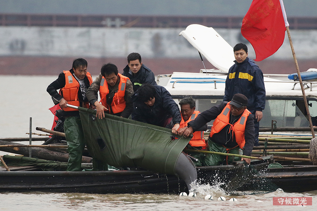 2016年10月31日,长江干流,渔民将撞上围网的江豚抬上担架。2013年,世界自然保护联盟物种生存委员会将长江江豚列入“极度濒危”级别。目前,长江江豚种群数量不足千头,为了更好地保护江豚,2015年农业部首次对长江江豚实施迁地保护,将江豚迁到与它生活环境类似的水域。