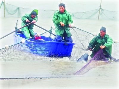 上午9时,科学捕豚队又发现了3头江豚!渔民高兴地叫道:“还是两大一小的一家三口!”2条捕捞船匀速跟踪。江豚离岸边80米了,2条船迅速同时放网包围。仅5分钟,深10米的网形成包围之势,成功围住江豚。清点围网内的江豚时,没想到除了一家3口外,还有另外2只江豚。这意外的收获让大家惊喜万分。
