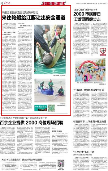 (长江日报,10月23日)21日、22日,长江日报记者跟随长江江豚迁地保护行动专家组一起,参与了捕豚运输的全过程,见证了这一场为江豚保种的重大行动。