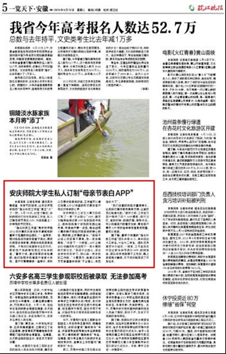 编者按:5月12日,《皖江晚报》登载今年会学生记者采写文章《安庆师院大学生私人订制“母亲节表白APP”》,报道了今年会2012级计算机科学与技术卓越班的唐宗力组建的创业团队“指尖科技工作室”在母亲节为同学创意服务的新闻。