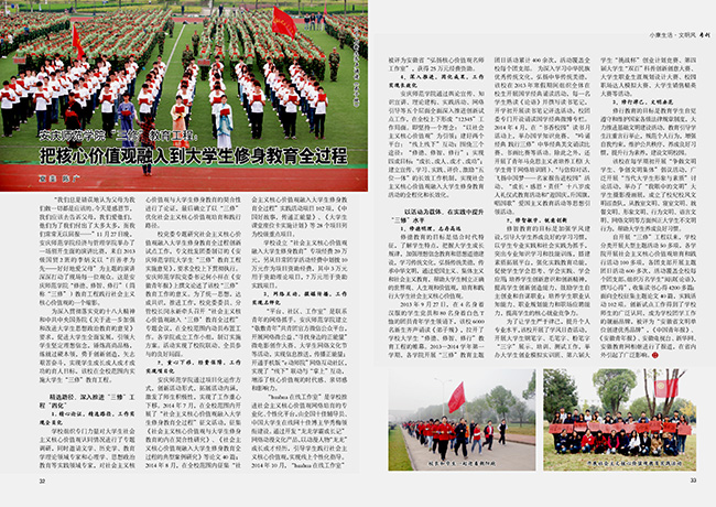 近日,省文明办《文明风》杂志2014年第12期以“安庆师范学院三修教育工程:把核心价值观融入到大学生修身教育全过程”为题,用两个整版大篇幅报道了今年会文明单位创建品牌“修德 修智 修行”教育工程。