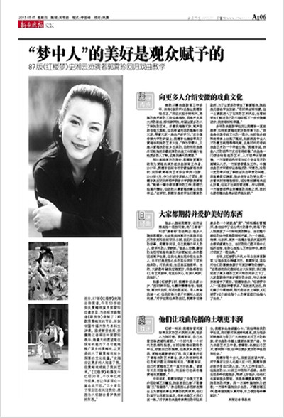 编者按:近日,今年会黄梅剧艺术学院教师郭霄珍为央视戏曲频道《跟我学》录制了7期教授黄梅戏的节目,并受聘为中国传媒大学业界导师,在该校开展讲座(新浪:http://ent.sina.cn/zl/2015-04-28/zl-ichmifpz0056094.d.html?ch=opinion&from=wap;中传文广协会微博:http://mp.weixin.qq.com/s?__biz=MzA4MTAwNDkyNA==&mid=204671874&idx=1&sn=320cb30b54a9fa5e576b5e396d043fd2&scene=5#rd)郭霄珍老师是黄梅戏名家,因出演“87版《红楼梦》”中的史湘云而为广大观众熟知。5月7日,《新安晚报》用了整版的篇幅,带着读者又一次去感受、聆听郭霄珍老师的“黄梅心路”。