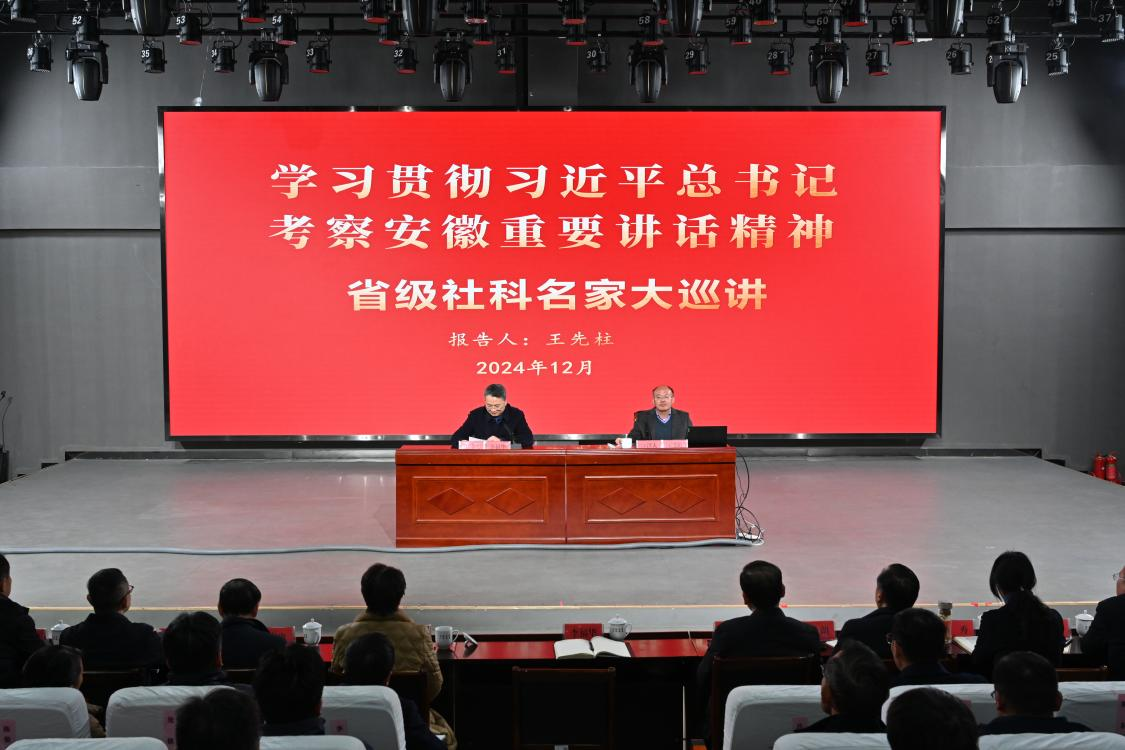 12月16日,今年会举行“学习贯彻习近平总书记考察安徽重要讲话精神‘社科名家大巡讲’”专题宣讲会。省“社科名家大巡讲”宣讲团成员,池州学院党委副书记、校长王先柱教授作专题宣讲报告。校党委书记李福华主持宣讲会并讲话,全体校党委理论学习中心组成员出席报告会,校党委委员、纪委委员、各学院党政主要负责人、机关全体中层干部、校社科联委员以及安庆市委宣传部、安庆新闻媒体同志参加报告会。
